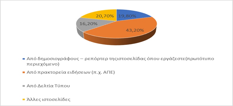 Συγκεκριμένα το 50,5% των συμμετεχόντων υιοθετούν το copy paste «πολύ συχνά» στην εργασία τους (διάγραμμα 6). Σύμφωνα εξάλλου με την θεωρητική επισκόπηση της εργασίας, οι δημοσιογράφοι στηρίζονται κατά κύριο λόγο σε δελτία τύπου επιχειρήσεων και φορέων αναπαράγοντας το περιεχόμενο που αποστέλλεται μαζικά και διοχετεύοντας ειδήσεις μέσα από τα διαδικτυακά μέσα, χωρίς να επεξεργάζονται ιδιαίτερα το περιεχόμενο, πόσο μάλλον να το διασταυρώνουν και να αναφέρουν την πηγή προέλευσης, τάσεις που αποτυπώνονται στα αποτελέσματα του εμπειρικού μέρους. Αντίστοιχα, παρεμφερείς έρευνες δείχνουν πως το μεγαλύτερο ποσοστό των άρθρων που δημοσιεύονται διαδικτυακά αποτελεί προϊόν αντιγραφής, είτε σε ένα βαθμό, είτε αυτούσιας αναπαραγωγής και πρόκειται ειδικότερα για κείμενα που προέρχονται αφενός από ειδησεογραφικά πρακτορεία, είτε από δελτία τύπου (Καράν,2005).