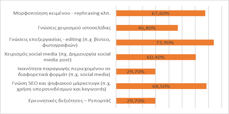 Τα ευρήματα της έρευνας επιβεβαιώνουν την ανάγκη ο σύγχρονος δημοσιογράφος να διαθέτει ένα χαρτοφυλάκιο δεξιοτήτων και εργαλείων. Στην κορυφή των δεξιοτήτων που ενσωματώνει ο σύγχρονος δημοσιογράφος ροής σύμφωνα με τα αποτελέσματα της έρευνας βρίσκονται κατεξοχήν τα τεχνικά στοιχεία, όπως είναι η γνώση των κανόνων SEO (68,5%), η επεξεργασία βίντεο και φωτογραφιών (73,9%), η μορφοποίηση κειμένου (67,6%) και το λεγόμενο rephrasing (67,6%), δηλαδή η παράφραση κειμένου, και η χρήση των social media (60,4%), ενώ σχεδόν στην τελευταία θέση με 29,7% βρίσκονται οι ερευνητικές δεξιότητες που περιγράφουν τα ποιοτικά και παραδοσιακά στοιχεία του δημοσιογράφου (διάγραμμα 2).