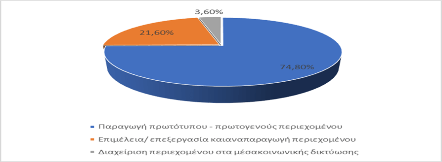 Αντιστοίχως, τα ευρήματα της έρευνας κατέληξαν σε μεγάλο ποσοστό (74,8%) πως ο ρόλος του δημοσιογράφου ροής περιγράφεται μέσα από τις πρακτικές της επιμέλειας και επεξεργασίας περιεχομένου και συνεπώς της αναπαραγωγής και όχι της παραγωγής (διάγραμμα 1).