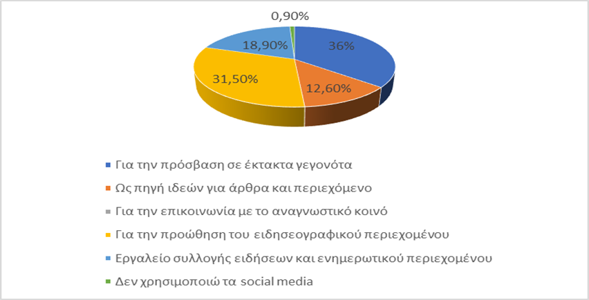 Τα Μέσα Κοινωνικής Δικτύωσης σύμφωνα με τα αποτελέσματα της έρευνας για τους δημοσιογράφους ροής συνιστούν μέσα κατά κύριο λόγο για την πρόσβαση σε έκτακτα γεγονότα (36%) (διάγραμμα 10) πράγμα που επιβεβαιώνεται και μέσα από την βιβλιογραφική ανάλυση που προηγήθηκε και σύμφωνα με την οποία οι εφαρμογές των μέσων κοινωνικής δικτύωσης γίνονται το νέο πεδίου του «ζωντανού» ρεπορτάζ, ενώ παράλληλα οι δημοσιογράφοι χρησιμοποιούν τα Μέσα Κοινωνικής Δικτύωσης όπως το X (Twitter), το Instagram ή το Facebook, με σκοπό τόσο να προωθήσουν το περιεχόμενο που παράγουν, την πρόσβαση σε έκτακτες ειδήσεις, όσο και με σκοπό την επικοινωνία με το αναγνωστικό κοινό.