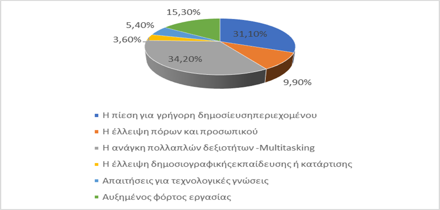 Σύμφωνα με την έρευνα, στις πρώτες δύο θέσεις βρίσκονται «η ανάγκη πολλαπλών δεξιοτήτων» και «η πίεση για γρήγορη δημοσίευση περιεχομένου», δύο τάσεις που αποτελούν τον πυρήνα της σύγχρονης δημοσιογραφίας. Μέχρι αυτό το σημείο η δημοσιογραφία φαίνεται να βυθίζεται όλο και περισσότερο σε τάσεις υπονομευτικές για το παραγόμενο περιεχόμενο και την ενημέρωση εν γένει.