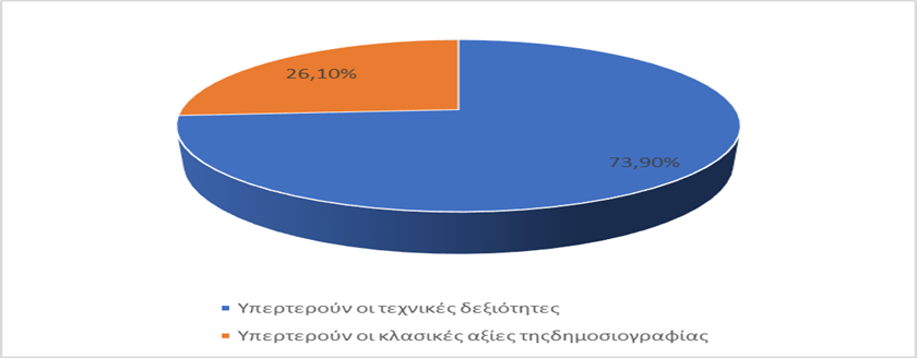 Ευρήματα που συμπλέουν με τη σύγχρονη δημοσιογραφική πρακτική που υπαγορεύει στον εργαζόμενο να εκτελεί πολλαπλές λειτουργίες και ρόλους, να βγάζει φωτογραφίες, βίντεο, να μοντάρει και να επεξεργάζεται περιεχόμενο, να διαχειρίζεται τα μέσα κοινωνικής δικτύωσης και να επικοινωνεί με το κοινό και συνεπώς να ενσωματώνει όλο και πιο ευέλικτα επαγγελματικά χαρακτηριστικά, και όλα αυτά σε βάρος της ποιοτικής και εμπεριστατωμένης δημοσιογραφίας, το οποίο επιβεβαιώνεται μέσα από τα αποτελέσματα και τις απαντήσεις της παρούσας εμπειρικής μελέτης, σύμφωνα με τις οποίες οι τεχνικές δεξιότητες στην εργασία του δημοσιογράφου ροής υπερτερούν (73,9%) (διάγραμμα 3) σε βάρος των κλασικών χαρακτηριστικών της δημοσιογραφίας (Deuze, 2007) .