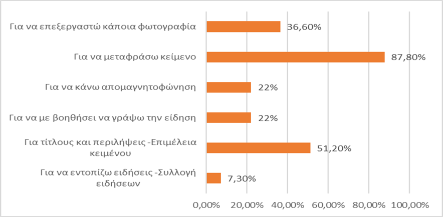 Σύμφωνα με τα αποτελέσματα, όσοι χρησιμοποιούν όμως τις τεχνολογίες της τεχνητής νοημοσύνης ήδη στην εργασία τους περιορίζονται κυρίως στην μετάφραση κειμένων (87,8%) και στην δημιουργία τίτλων και περιλήψεων (51,2%) και άρα στη παραγωγή περιεχομένου, ενώ ακολουθούν η επεξεργασία φωτογραφιών (36,6%), η απομαγνητοφώνηση (22%) και η σύνταξη ειδήσεων (22%) (διάγραμμα 12). Σύμφωνα με αντίστοιχες έρευνες το 90% των δημοσιογράφων χρησιμοποιεί εργαλεία τεχνητής νοημοσύνης για την παραγωγή περιεχομένου στο πλαίσιο της εργασίας του (Beckett, et al,2023).