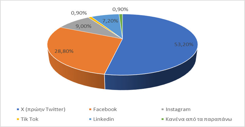 Τα παραπάνω αποτυπώνονται μέσα από τα αποτελέσματα της εμπειρικής έρευνας, όπου παρατηρήθηκε αυξημένη συχνότητα χρήσης των μέσων κοινωνικής δικτύωσης από δημοσιογράφους ροής για την άντληση πληροφοριών, ενώ στην κορυφή της χρήσης των μέσων κοινωνικής δικτύωσης για επαγγελματικούς λόγους βρίσκεται το X( Twitter) (53,2%), ενώ ακολουθούν το Facebook (28,8%) και το Instagram (9%) (διάγραμμα 11) σε πλήρη σύμπλευση με αντίστοιχες και μαζικότερες έρευνες (Pew Research Center, 2022).