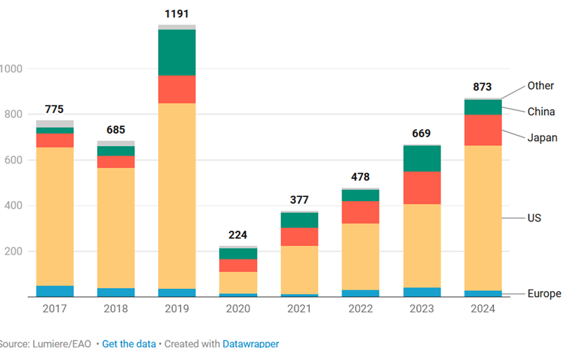 Αντίθετα, η Ευρώπη παρουσιάζει μια στασιμότητα, με τα εισιτήρια να παραμένουν 20% κάτω από τα προ πανδημίας επίπεδα. Αυτή η διαφορά αναδεικνύει την αδυναμία των ευρωπαϊκών παραγωγών να κεφαλαιοποιήσουν την παγκόσμια τάση. Ο ανταγωνισμός από τους μεγάλους παίκτες του Χόλιγουντ είναι σκληρός, και οι ευρωπαϊκές ταινίες συχνά δυσκολεύονται να βρουν την θέση τους στην αγορά, παρά την καλλιτεχνική τους αξία.