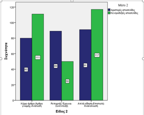 Τέλος, οι κεντροδεξιές ιστοσελίδες έχουν περισσότερα δημοσιεύματα με Απλή είδηση-Επιστολή-Ανακοίνωση (117) απ’ ότι οι αριστερές (91) χωρίς, όμως, η διαφορά αυτή να θεωρείται στατιστικά σημαντική.
