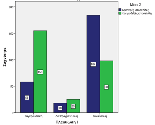 Όπως βλέπουμε στο γράφημα 1, οι κεντροδεξιές ηλεκτρονικές ιστοσελίδες (kathimerini.gr, tanea.gr protothema.gr, newsit.gr, news247.gr, iefimerida.gr) έχουν μεγαλύτερο αριθμό Κύριων άρθρων, Άρθρων γνώμης και ανάλυσης (111) από τις αριστερές ιστοσελίδες (avgi.gr, efsyn.gr, zougla.gr, rizospastis.gr) (80)[3].