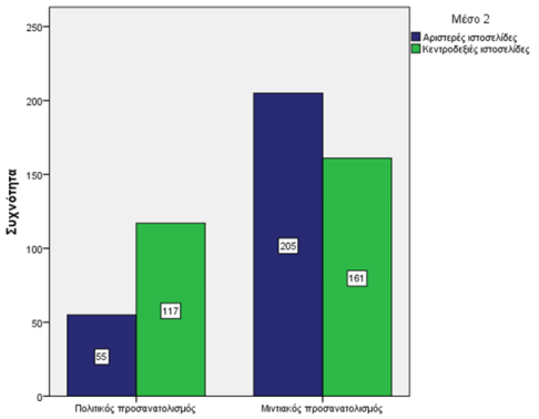 Το γράφημα 5 μας δείχνει ότι οι κεντροδεξιές ιστοσελίδες (117) έχουν περισσότερα δημοσιεύματα πολιτικού προσανατολισμού απ’ ότι οι αριστερές (55). Από την άλλη πλευρά, οι αριστερές (205) έχουν περισσότερα δημοσιεύματα μιντιακού προσανατολισμού από τις κεντροδεξιές (161).