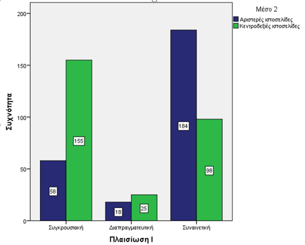 Τέλος, οι κεντροδεξιές ιστοσελίδες έχουν περισσότερα δημοσιεύματα με Απλή είδηση-Επιστολή-Ανακοίνωση (117) απ’ ότι οι αριστερές (91) χωρίς, όμως, η διαφορά αυτή να θεωρείται στατιστικά σημαντική.