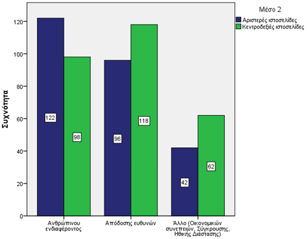 Σύμφωνα με το γράφημα 4, υπάρχει μεγάλη διαφοροποίηση στο Ανθρώπινο ενδιαφέρον με 122 δημοσιεύματα στις αριστερές και 98 στις κεντροδεξιές, ενώ στην απόδοση ευθυνών η διαφοροποίηση είναι μικρότερη με 96 στις αριστερές και 118 στις κεντροδεξιές όπως και στις Οικονομικές συνέπειες-Σύγκρουση-Ηθική διάσταση όπου οι κεντροδεξιές ιστοσελίδες υπερισχύουν με 62 δημοσιεύματα έναντι 42 των αριστερών.