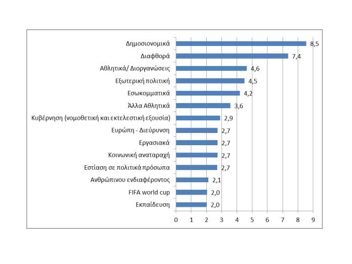 Όπως ήταν αναμενόμενο, το κύριο θέμα ήταν τα δημοσιονομικά ελλείμματα της χώρας (προσδιορισμός και αντιμετώπιση της οικονομικής κρίσης), η διαφθορά (διερεύνηση διαφόρων σκανδάλων), η εξωτερική πολιτική και τα εσωκομματικά ζητήματα. Τα αθλητικά εν γένει είχαν υψηλή θέση στην ημερήσια θεματολογία και κατά δεύτερο λόγο το κυβερνητικό έργο, η Ευρώπη σε σχέση με την οικονομική κρίση στην Ελλάδα και στα υπόλοιπα ευρωπαϊκά κράτη, τα εργασιακά κλπ. Επίσης, τα εν λόγω κύρια θέματα συχνά εμφανίζονται (ιδίως τα δημοσιονομικά, η διαφθορά και τα εσωκομματικά και τα εργασιακά) ως δευτερεύον θέμα σε πολλές ειδήσεις (Διάγραμμα 5).