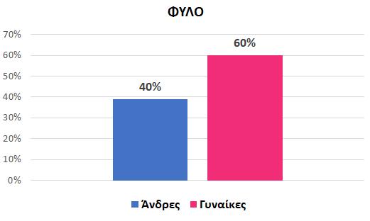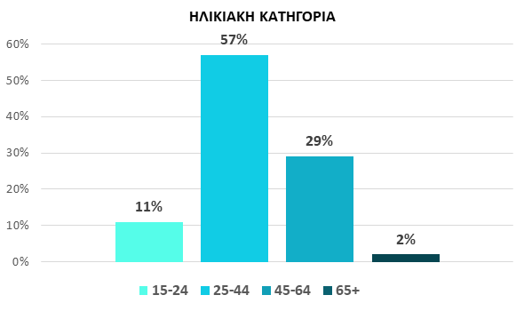 Ως προς τα βασικά δημογραφικά χαρακτηριστικά, το δείγμα της έρευνας συγκροτείται κατά 60% από γυναίκες και 40% από άνδρες. Η συντριπτική πλειοψηφία εξ αυτών ανήκει στην ηλικιακή κατηγορία 25-44 (57%), ακολουθούν τα άτομα 45-64 (29%), ενώ αρκετά λιγότεροι είναι οι συμμετέχοντες που εντάσσονται στα δύο αντίθετα άκρα των ηλικιακών ομάδων, δηλαδή στην κατηγορία 15-24 (11%) και 65 ετών κι άνω (2%).