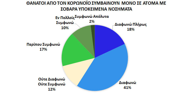 Ωστόσο, φαίνεται να αναγνωρίζουν τη σοβαρότητα της νόσου, καθώς ένα μεγάλο ποσοστό (41%) δεν συμφωνεί με την τοποθέτηση ότι ο Κορωνοϊός πλήττει θανάσιμα μόνο τα άτομα με σοβαρά υποκείμενα νοσήματα.