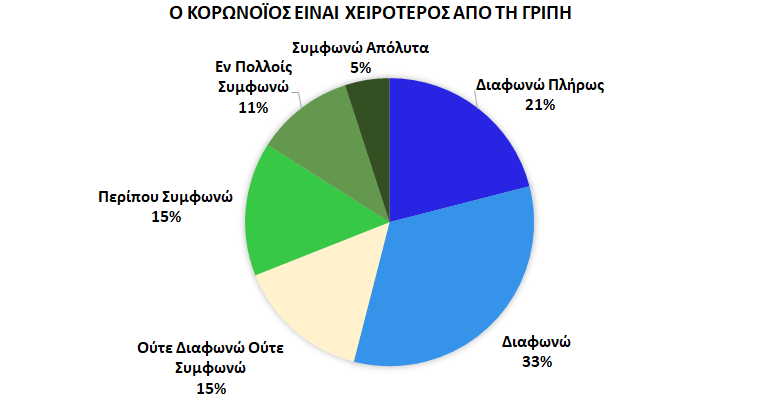 Παρόλα αυτά ο Κορωνοϊός δεν αξιολογείται χειρότερος από την κοινή γρίπη (33% διαφωνούν και 21% διαφωνούν πλήρως ότι είναι χειρότερος).