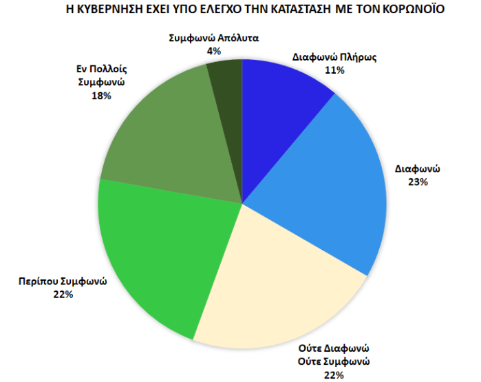 Στο τελευταίο αυτό ζήτημα, οι συμμετέχοντες στην έρευνα κατά 44% δείχνουν να συμφωνούν ότι η κυβέρνηση έχει τον έλεγχο της κατάστασης (22% περίπου συμφωνούν, 18% συμφωνούν εν πολλοίς, και 4% συμφωνούν απόλυτα), ενώ αντίθετα 34% διαφωνούν με την αποτελεσματικότητα των μέτρων (23% διαφωνούν και 11% διαφωνούν πλήρως). Επίσης, ένα σημαντικό ποσοστό των ερωτηθέντων της τάξης του 22% υιοθετούν μια ενδιάμεση τοποθέτηση (δηλαδή ούτε συμφωνούν αλλά ούτε διαφωνούν).