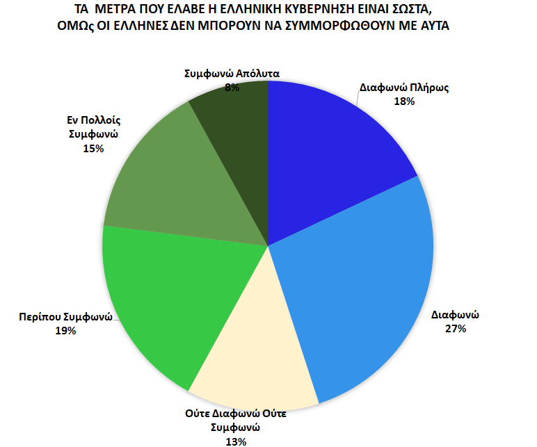 Αρκετά μοιρασμένη και διχοτομημένη είναι επίσης η άποψη σχετικά με την παραδοχή περί έλλειψης ικανότητας των Ελλήνων στο να συμμορφωθούν με τα μέτρα αντιμετώπισης διασποράς του Κορωνοϊού. Σύμφωνα με τα ευρήματα της έρευνας, ενώ υπάρχει μια ισχυρή τάση διαφωνίας (27%) ή και πλήρους διαφωνίας (18%) με την παραπάνω παραδοχή, που φαίνεται να υπερτερεί, αξιοσημείωτες σε αριθμό είναι και οι φωνές που ενστερνίζονται την αντίθετη άποψη, ότι δηλαδή οι Έλληνες δεν μπορούν να συμμορφωθούν με τα κυβερνητικά μέτρα (περίπου συμφωνώ 19% και εν πολλοίς συμφωνώ 15%).