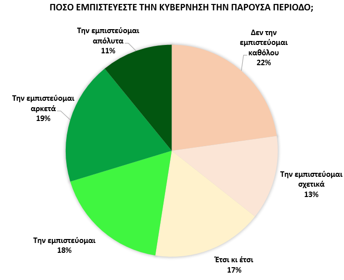 Καθώς η πλειονότητα των συμμετεχόντων στην έρευνα είναι αριστερής και κεντροαριστερής προέλευσης ή τοποθέτησης (64% αθροιστικά), το γεγονός ότι ένα συνολικό ποσοστό της τάξης του 48% δηλώνει – με διάφορες διαβαθμίσεις – ότι εμπιστεύεται την κυβέρνηση (18% την εμπιστεύεται, 19% την εμπιστεύεται αρκετά και 11% την εμπιστεύεται απόλυτα) είναι μάλλον θετικό για ένα δεξιόστροφο κυβερνητικό σχήμα.