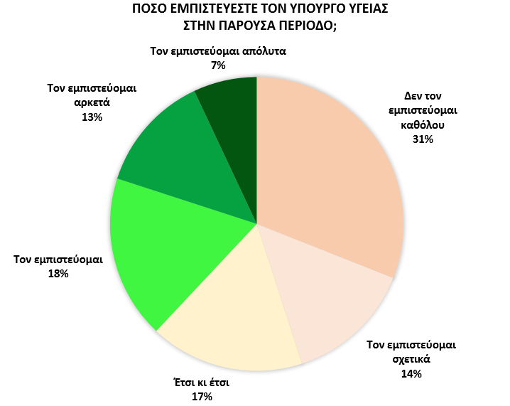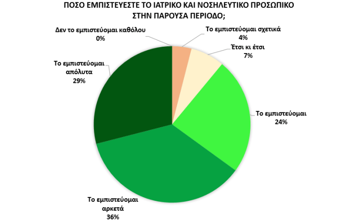 Αντιθέτως, σε πολύ υψηλά επίπεδα (89%) κυμαίνεται η εμπιστοσύνη προς τους πρωταγωνιστές της υγείας, ξεχωρίζοντας ιδιαίτερα το ιατρικό και νοσηλευτικό προσωπικό της χώρας (24% το εμπιστεύεται, 36% το εμπιστεύεται αρκετά, 29% το εμπιστεύεται απόλυτα).