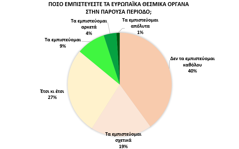 Από την άλλη πλευρά, έκδηλη είναι η έλλειψη εμπιστοσύνης μεγάλου μέρους των συμμετεχόντων στην έρευνα προς τα ευρωπαϊκά θεσμικά όργανα (40% δεν τα εμπιστεύονται καθόλου) με ένα άλλο μέρος να εκφράζει απλά συγκρατημένη εμπιστοσύνη (19% τα εμπιστεύονται σχετικά και 27% έτσι κι έτσι).