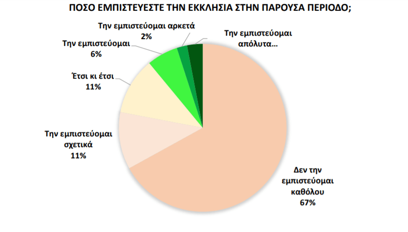 Έντονη είναι η έλλειψη αξιοπιστίας που αποδίδει το μεγαλύτερο μέρος των ερωτώμενων προς το θεσμό της εκκλησίας (67% δεν την εμπιστεύεται καθόλου), ενδεχομένως λόγω των συμβάντων μη τήρησης των μέτρων για την αντιμετώπιση της διασποράς της πανδημίας που έγιναν μέχρι το οριστικό κλείσιμο των εκκλησιών.