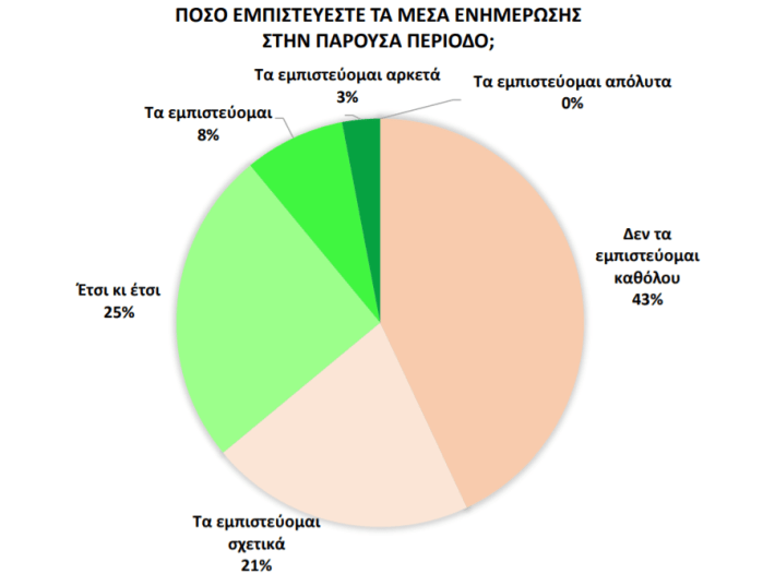 Τα μέσα ενημέρωσης, αν και αποτελούν τον βασικό συνδετικό κρίκο των μελών του κοινού με τις εξελίξεις της πανδημίας, δεν φαίνεται να έχουν πείσει για την αξιόπιστη στάση τους, καθώς το μεγαλύτερο μέρος του δείγματος της έρευνας δηλώνει πως δεν τα εμπιστεύεται καθόλου (43%) ή τα εμπιστεύεται συγκρατημένα (25% έτσι κι έτσι, 21% τα εμπιστεύεται σχετικά).