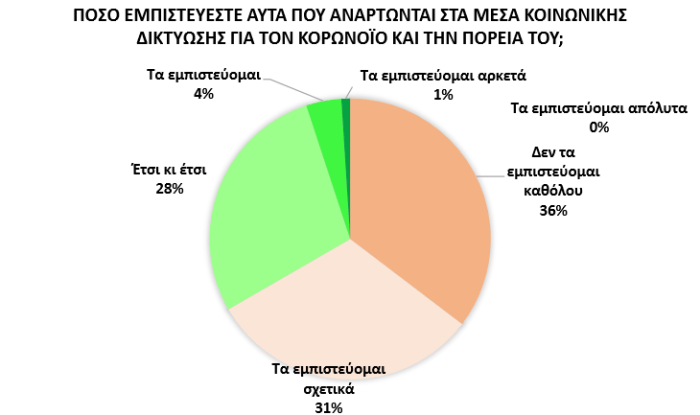 Εξίσου χαμηλά αξιολογείται από τους συμμετέχοντες στην έρευνα και η αξιοπιστία της διαχεόμενης πληροφόρησης στα μέσα κοινωνικής δικτύωσης, αφού οι περισσότεροι είτε δεν τα εμπιστεύονται καθόλου (35%) είτε τα εμπιστεύονται σχετικά (31%).