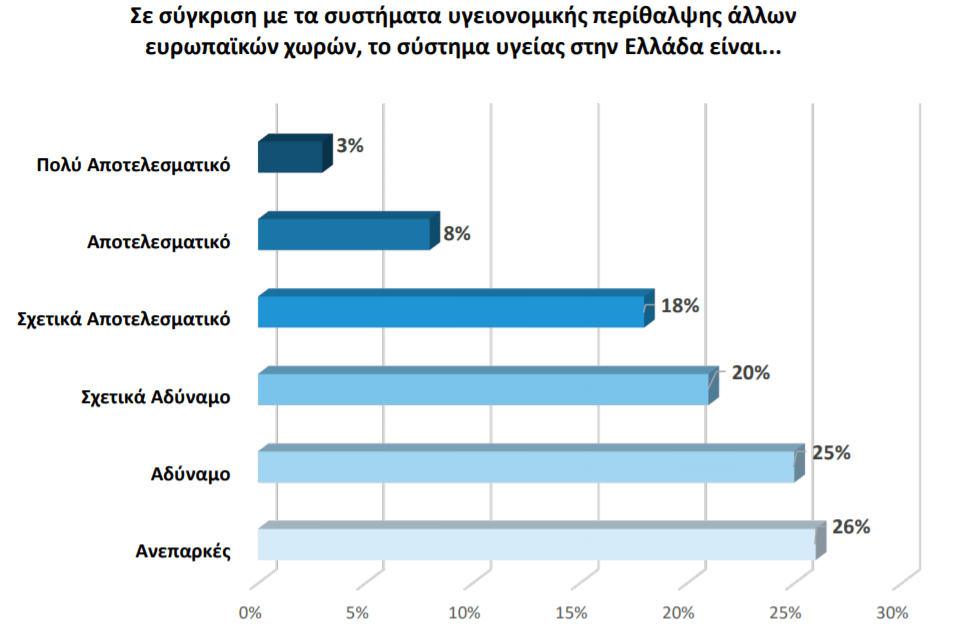 Ωστόσο, δεν παραβλέπουν τα προβλήματα που παρουσιάζει το σύστημα υγείας της Ελλάδας, το οποίο -συγκριτικά με αυτό άλλων ευρωπαϊκών χωρών- χαρακτηρίζεται κυρίως ως ανεπαρκές (26%), ως αδύναμο (25%) ή σχετικά αδύναμο (20%).