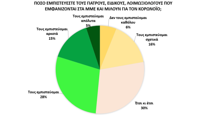 Δεν ισχύει όμως το ίδιο για τους γιατρούς και λοιπούς ειδικούς που εμφανίζονται στα μέσα ενημέρωσης για να σχολιάσουν τις εξελίξεις γύρω από τη νόσο, για τους οποίους το κοινό εκφράζει ένα είδος πιο συγκρατημένης εμπιστοσύνης (28% τους εμπιστεύεται, 15% αρκετά και 5% τους εμπιστεύεται απόλυτα).