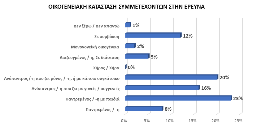 Ως προς την οικογενειακή κατάσταση οι περισσότεροι είναι είτε παντρεμένοι με παιδιά (23%) είτε ανύπαντροι που ζουν μόνοι ή με κάποιο συγκάτοικο (20%) και ακολουθούν οι ανύπαντροι που ζουν με γονείς ή συγγενείς (16%) ή τα άτομα σε συμβίωση (12%). Ελάχιστοι στο δείγμα είναι οι διαζευγμένοι ή τα άτομα σε διάσταση (5%) καθώς και τα μέλη μονογονεϊκής οικογένειας (2%).