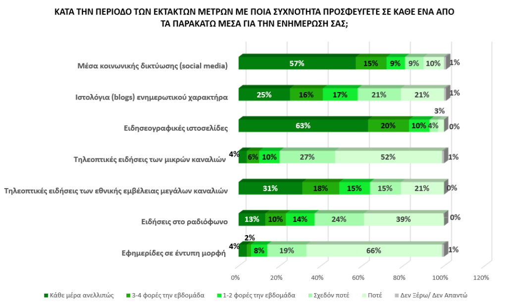 Σύμφωνα με τα ευρήματα της έρευνας, οι ερωτώμενοι προσφεύγουν για την ενημέρωσή τους σχετικά με τις εξελίξεις της πανδημίας, κατά ένα μεγάλο ποσοστό, κυρίως στις ειδησεογραφικές ιστοσελίδες και τα μέσα κοινωνικής δικτύωσης και δευτερευόντως στα τηλεοπτικά κανάλια εθνικής εμβέλειας. Είναι χαρακτηριστικό ότι στην περίπτωση των ιστοσελίδων, η επιλογή αυτή αποτελεί ανελλιπή καθημερινή συνήθεια για το 63% των συμμετεχόντων της έρευνας και στην περίπτωση των μέσων κοινωνικής δικτύωσης για το 57% των ερωτώμενων. Σημαντικό επίσης μέρος του δείγματος (31%) δηλώνει καθημερινή, αν όχι πιο περιστασιακή, προτίμηση στις τηλεοπτικές ειδήσεις των εθνικής εμβέλειας καναλιών.