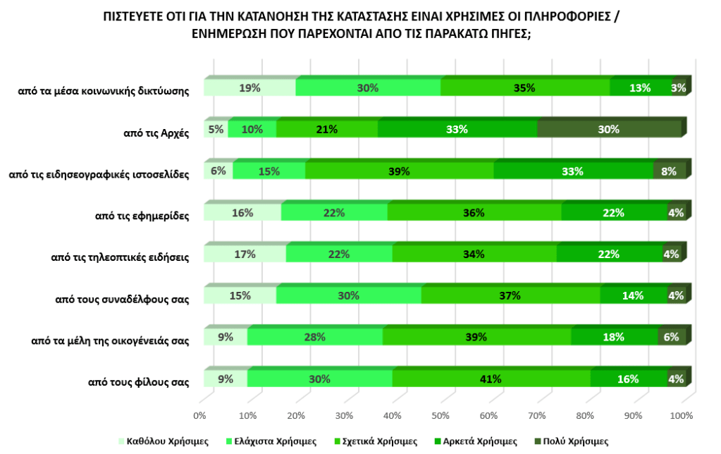 Επίσης, ενδιαφέρον στοιχείο είναι ότι παρά την εξάρτηση του κοινού από τα μέσα ενημέρωσης (παραδοσιακά και ψηφιακά), οι συμμετέχοντες στην έρευνα θεωρούν ότιη πληροφόρηση που πηγάζει από τις Αρχές, είναι αρκετά χρήσιμη (33%) και πολύ χρήσιμη (30%).