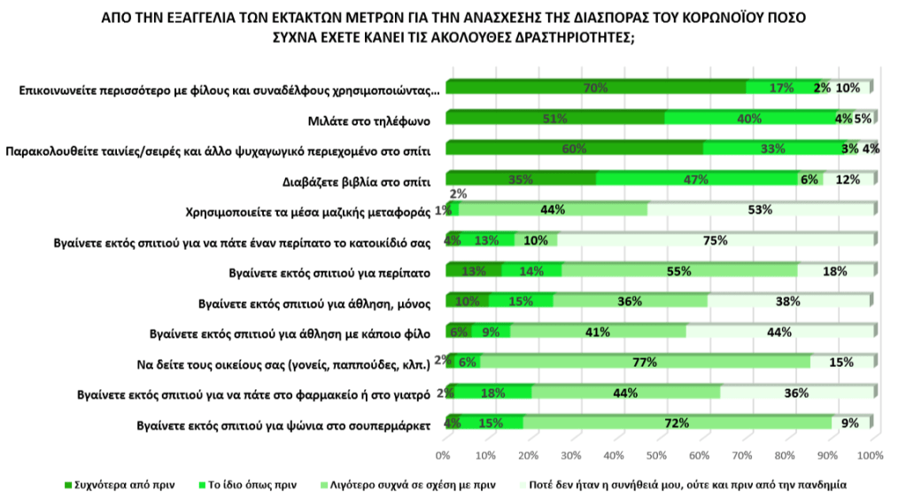 Αντιθέτως, συνήθειες που έχουν υιοθετηθεί στο πλαίσιο της καθημερινότητας και πραγματοποιούνται με μεγαλύτερη συχνότητα σε σχέση με το παρελθόν είναι η εξ αποστάσεως επικοινωνία με φίλους και συναδέλφους μέσω ψηφιακών εφαρμογών τηλεδιάσκεψης (70%), η παρακολούθηση ψυχαγωγικού περιεχομένου (ταινιών, σειρών) εντός της οικίας (60%) καθώς και οι συνομιλίες μέσω τηλεφώνου (51%).
