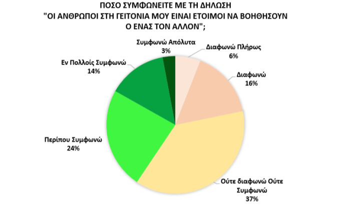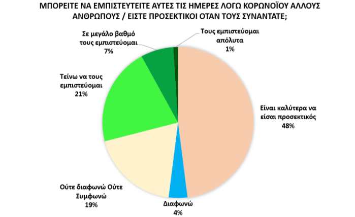 Αυτή η ροπή του κοινού προς την εξ αποστάσεως επικοινωνία αξίζει να ιδωθεί αλληλένδετα με την επιφυλακτική στάση που εκφράζουν οι μισοί σχεδόν ερωτώμενοι (48%) για τις δια ζώσης συναντήσεις με άλλους ανθρώπους, όπου θεωρούν ότι το να είναι κάποιος προσεκτικός αποτελεί ενδεδειγμένη στάση. Αυτή η συγκρατημένη στάση προς τον συνάνθρωπο στην εποχή της πανδημίας αντικατοπτρίζεται και στην αμφιβολία ή έστω συγκρατημένη αισιοδοξία που εκφράζει μεγάλο μέρος του κοινού για το εάν οι άνθρωποι στη γειτονιά είναι έτοιμοι να βοηθήσουν ο ένας τον άλλον (38% ούτε συμφωνεί, ούτε διαφωνεί, 22% διαφωνεί ή διαφωνεί πλήρως).