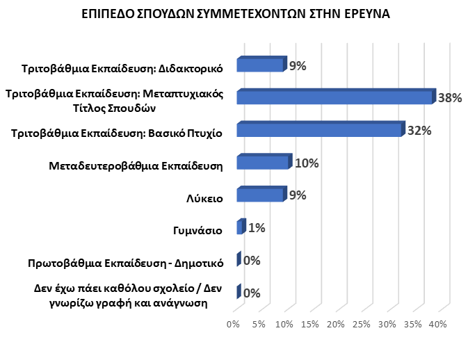 Οι συμμετέχοντες στην έρευνα είναι κατά κύριο λόγο άτομα υψηλού μορφωτικού επιπέδου που κατέχουν είτε βασικό τίτλο σπουδών (32%) είτε μεταπτυχιακό (38%). Αρκετοί στο δείγμα είναι ακόμα και κάτοχοι διδακτορικού (9%). Συγκριτικά με το συνολικό κοινό πανεπιστημιακής μόρφωσης, πολύ λιγότεροι είναι οι ερωτώμενοι που έχουν ολοκληρώσει σπουδές μεταδευτεροβάθμιας εκπαίδευσης (10%) ή έχουν απολυτήριο λυκείου (9%), ενώ ελάχιστοι είναι οι απόφοιτοι γυμνασίου (1%).