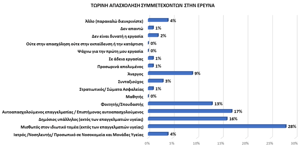 Από πλευράς απασχόλησης, το δείγμα της έρευνας συγκροτείται κυρίως από μισθωτούς του ιδιωτικού τομέα, που δεν σχετίζονται με τα επαγγέλματα υγείας (28%), από αυτοαπασχολούμενους επαγγελματίες (επιστήμονες ή μη, 17%), δημοσίους υπαλλήλους (πέραν των επαγγελμάτων υγείας, 16%) καθώς και από φοιτητές (13%). Σε πολύ μικρά ποσοστά κυμαίνονται οι άνεργοι (9%), οι εργαζόμενοι στις δομές της υγείας (4%) καθώς και οι απολυμένοι (1%).