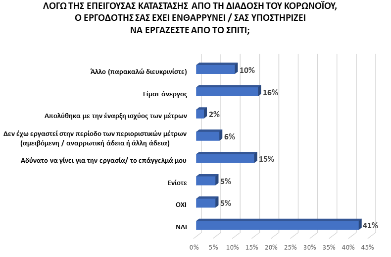 Σε σχέση με τον εργασιακό βίο των ερωτώμενων, έτσι όπως διαμορφώθηκε στην εποχή μετά τη διασπορά του Κορωνοϊού, το μεγαλύτερο μέρος του δείγματος της έρευνας, λόγω των έκτακτων συνθηκών της πανδημίας και των περιοριστικών μέτρων που επιβλήθηκαν, έχει οδηγηθεί στην κατ’ οίκον εργασία με την κατάλληλη υποστήριξη του εργοδότη (41%), ενώ ένα μικρό μόνο ποσοστό δηλώνει αδυναμία άσκησης του επαγγέλματός εντός της οικίας (15%). Ελάχιστοι είναι οι ερωτώμενοι του δείγματος που δεν έχουν εργαστεί καθόλου στην περίοδο των περιοριστικών μέτρων (6%) λόγω άδειας (αμειβόμενης, αναρρωτικής ή άλλης) ή αυτοί που απολύθηκαν όταν τέθηκαν σε εφαρμογή τα έκτακτα μέτρα (2%).
