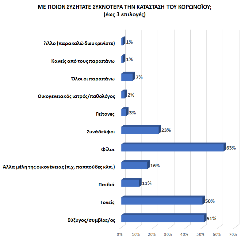Σύμφωνα με τα ευρήματα της έρευνας, οι Έλληνες συζητούν το θέμα του Κορωνοϊού κατά κύριο λόγο με τους φίλους τους και δευτερευόντως με τους/τις συζύγους/συντρόφους τους, ενώ ο οικογενειακός ιατρός/παθολόγος, που αντιπροσωπεύει μια εξειδικευμένη πηγή γνώσης, δεν αποτελεί ιδιαίτερο πόλο έλξης για διενέργεια σχετικής συζήτησης.